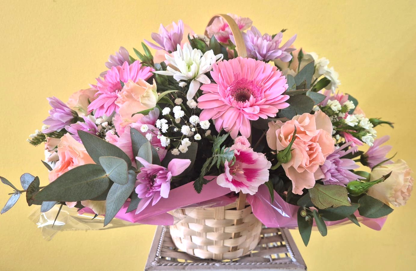 Our Blush Basket Arrangement is a graceful floral design created in gentle pink and white tones, ideal for celebrating life’s most meaningful moments. Featuring soft pink roses as the focal point, this arrangement is beautifully complemented by pink and white chrysanthemums, gerberas, gyp, white statice, and seasonal blooms such as godetia or sweet william, finished with lush greenery for balance and texture.