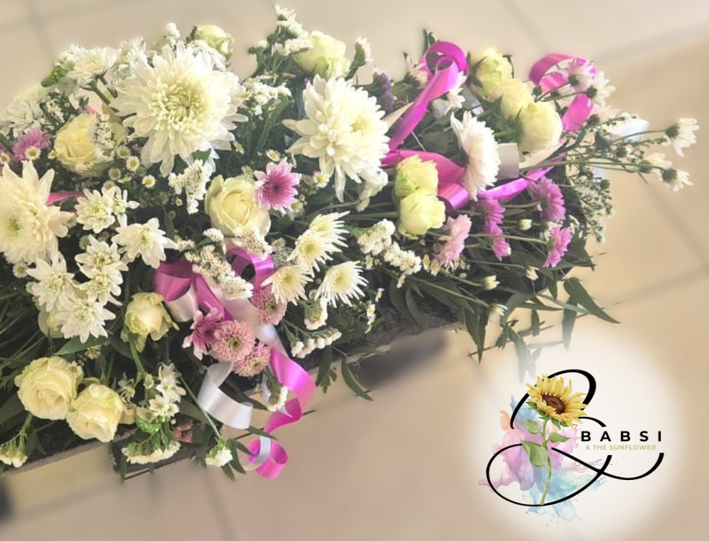 Our Coffin Spray Arrangement is thoughtfully designed to express love, respect, and remembrance through the beauty of fresh flowers. Created with care by Babsi & The Sunflower, each spray features a harmonious blend of blooms & greenery, arranged to flow gracefully across the casket.