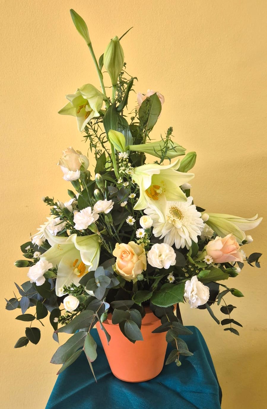 The Petals of Peace Terracotta arrangement is a gentle expression of comfort and beauty. Featuring white Asiatic lilies, gerberas, peach roses, Michaelmas daisies & pennygum greenery, this arrangement is set in oasis within a warm terracotta pot.