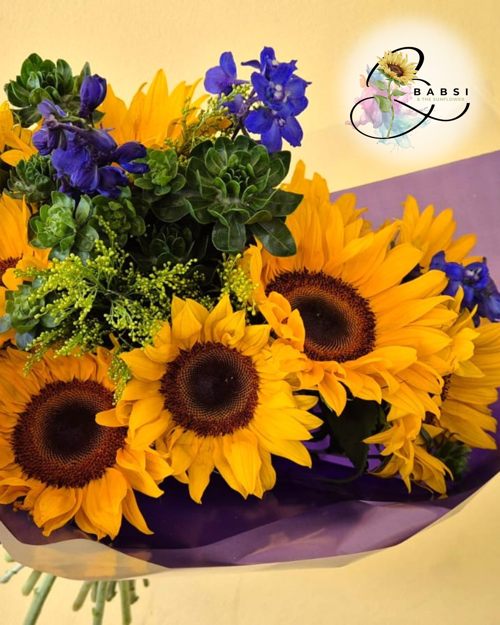 Brighten any space and lift spirits instantly with our Ray of Sunshine bouquet or vase arrangement. Bursting with color and warmth, this cheerful design showcases 10 bold sunflowers paired with blue delphiniums or purple statice (depending on seasonal availability), golden rod, finished with fresh greenery for balance and texture.